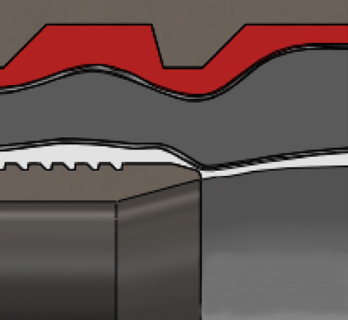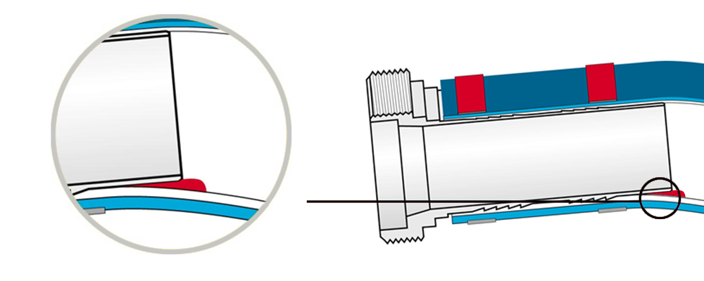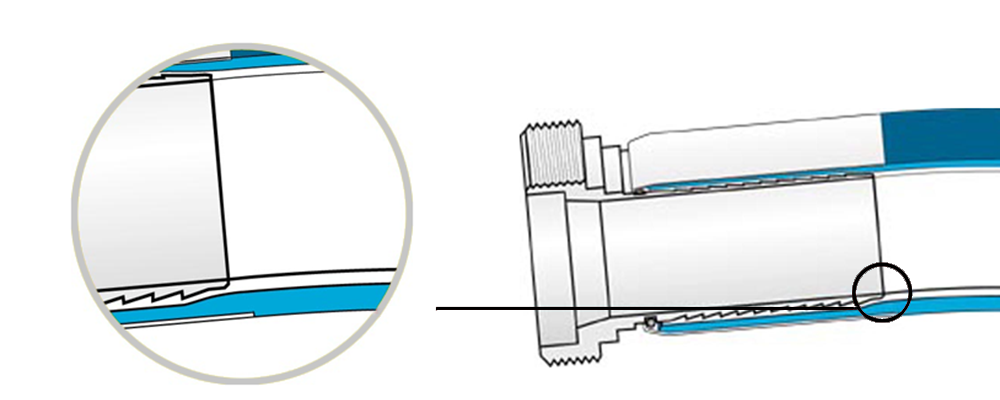 The profiles of the hose pillars and press sleeve must be compatible in order to obtain a correct compression. The crimp sleeve is slightly longer than the hose barb, so that the inner wall of the hose is pushed around it. This creates a functional smooth transition. Only a well-matched mix of parts will prevent the accumulation of debris.